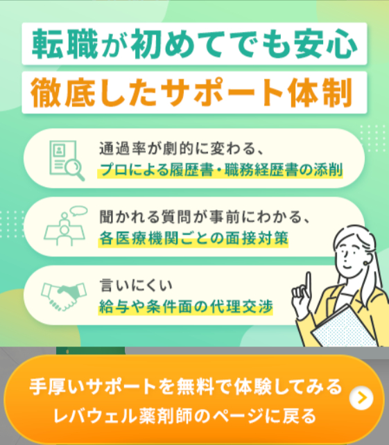 【PR】レバウェル薬剤師 今回紹介するのは、薬剤師の転職サービスです!薬剤師の転職支援に特化したサービスで、求人サイトにはない『非公開求人』(=好条件求人)を多数保有しているそうです!求人票にはない医療方針や、やめた人の理由などリアルな情報も聞けますよ(^^♪医療業界の転職支援14年以上の実績で、マッチング率の良い求人提案が魅力! 短期転職に強いので、早く転職したい方におすすめです!各地域、10か所の拠点ごとのコンサルタントから、地域に密着した提案も受けることができます!登録から非公開求人の公開、経歴書など、手厚いサポートもあり、希望にピッタリ合った職場の提案なども全部無料で受けられます!メッセージでやり取りもできるので、自分のペースで効率的に転職ができますね。気になる詳細は「詳細はこちら」ボタン、もしくは下記バナーをクリック👆 詳しくはこちらをクリック 転職相談 【自分に合った職場が探せる!】まずは無料登録をするだけ!転職先の相談や、気になっている職場のリアルな情報も転職のために必要な情報が、詳しく聞けるので嬉しいですね✨ 商材名 レバウェル薬剤師運営者 M.M※当サイトはアフィリエイトプログラムを利用し宣伝目的で作成しております。